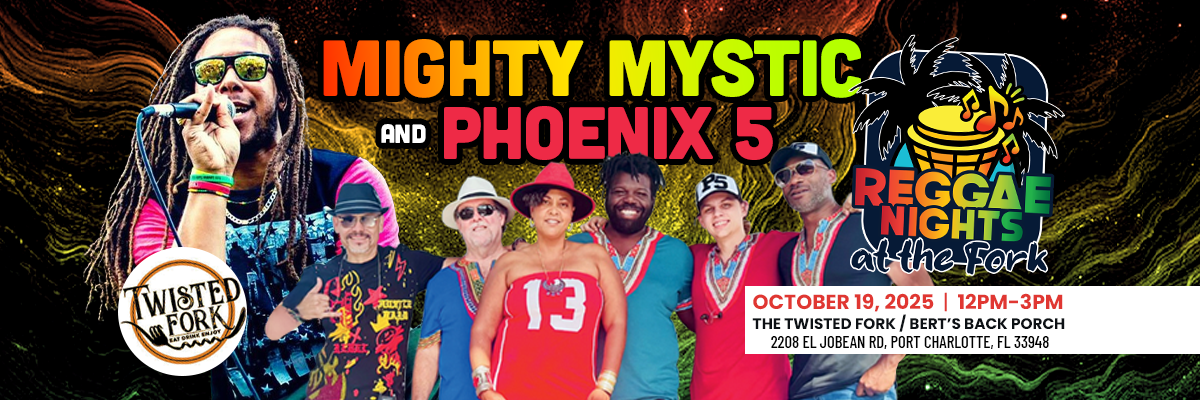 Experience Reggae Nights in Port Charlotte as Phoenix5 brings their award-winning mix of reggae, funk, and soul to Twisted Fork. Free GA, VIP tables available.